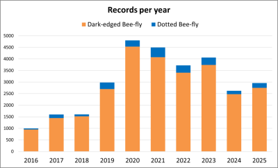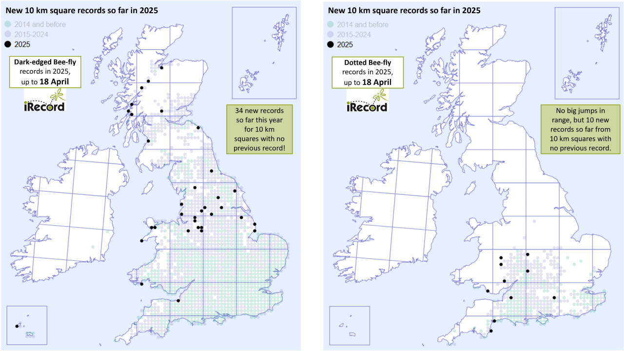 The have not been any big jumps in range during 2025, but there have been quite a lot of new records from 10 km squares where the spring bee-flies had not previously been reported. For Dark-edged Bee-fly this probably just represents better recording and more recorders getting involved, but for Dotted Bee-fly there are signs of the range continuing to expand a little around the edges:
