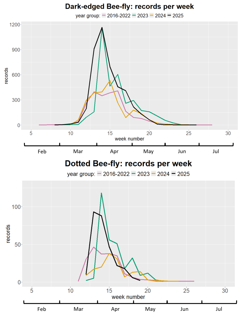 Thanks to the Bee-fly Watch records, we know that the timing of bee-fly emergence each year is closely tied to the temperature and sunshine levels in early spring. In 2024 we had a relatively cool and wet spring, and bee-flies were reported in much lower numbers than in 2023. In contrast, 2025 had warm sunny weather across much of the UK during March and April, and bee-fly records were much more numerous, reaching a similar peak to that seen in 2023.