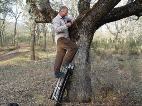 (Left) Malloch Society members at Chatelherault Country Park, near Hamilton in 1989, site of the ancient oaks of Cadzow SSSI : left to right David Horsfield, Iain McGowan, David Robertson, Geoff Hancock, Graham Rotheray, Kenn Watt, Steve Hewitt, Richard Lyszkowski. (Right) Geoff Hancock examining a rothole in Spain. A short history of the Malloch Society has been written by Kenn Watt (pdf).